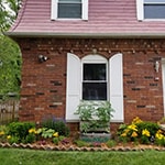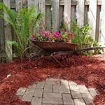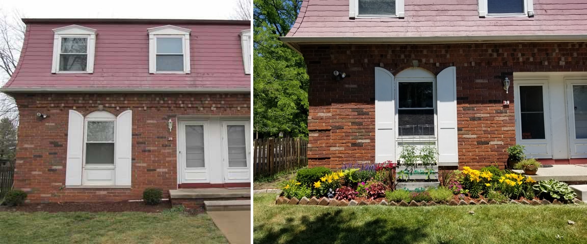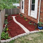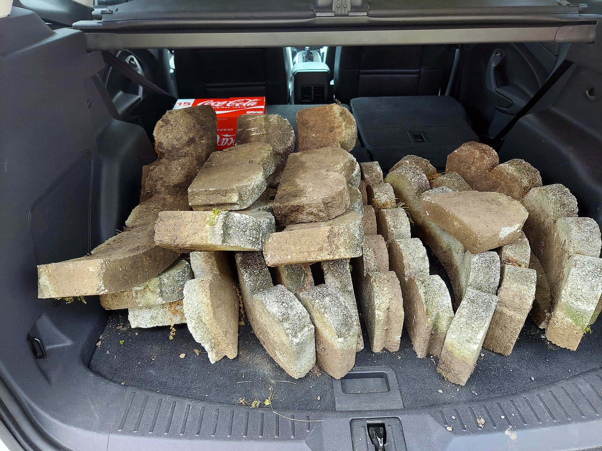 About a year after moving into my soon-to-become garden playground, I'd randomly decided to plant some of the seeds from a green bell pepper I was having on a hamburger. I put them in a small pot in my kitchen window. They sprouted and grew to about five inches tall, at which point I decided I should move them outside, in front of my home, where there was a dirt patch. The home owner's association maintains the lawns, but most of the units have about a three foot by twenty foot area where there's no grass, just very old mulch. They did really well for a week, then the lawn care people mistook them for weeds and whacked them away. I got peeved about that, so figured I'd make it obvious it was a garden space, and I put a little tilted brick wall along the front of it.