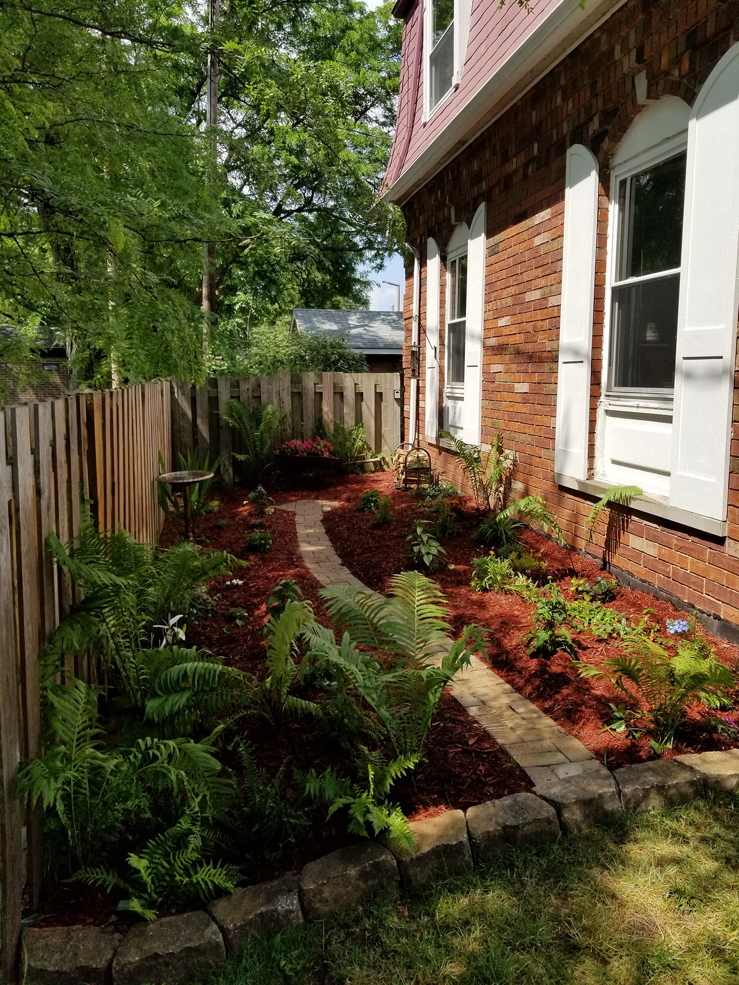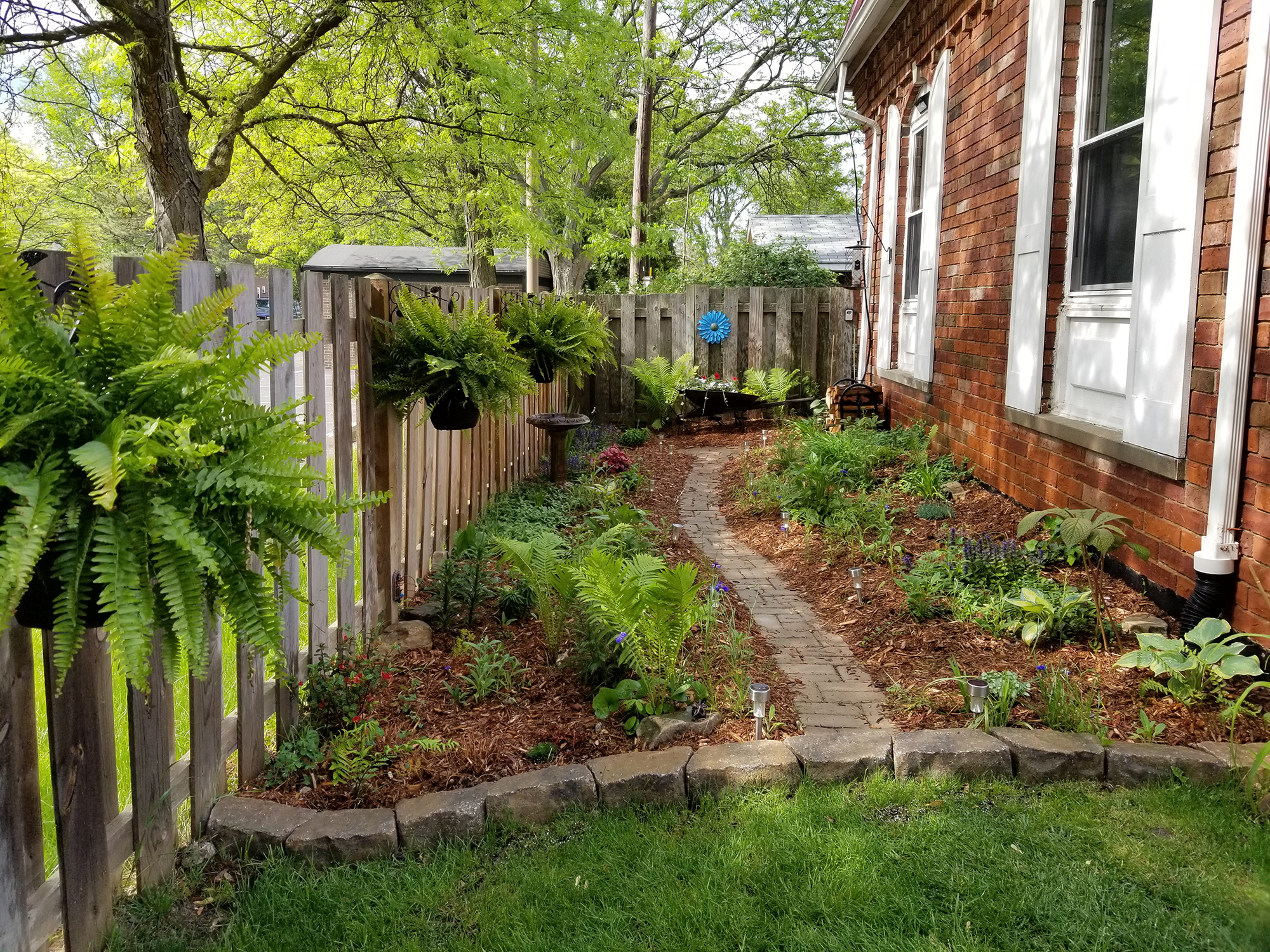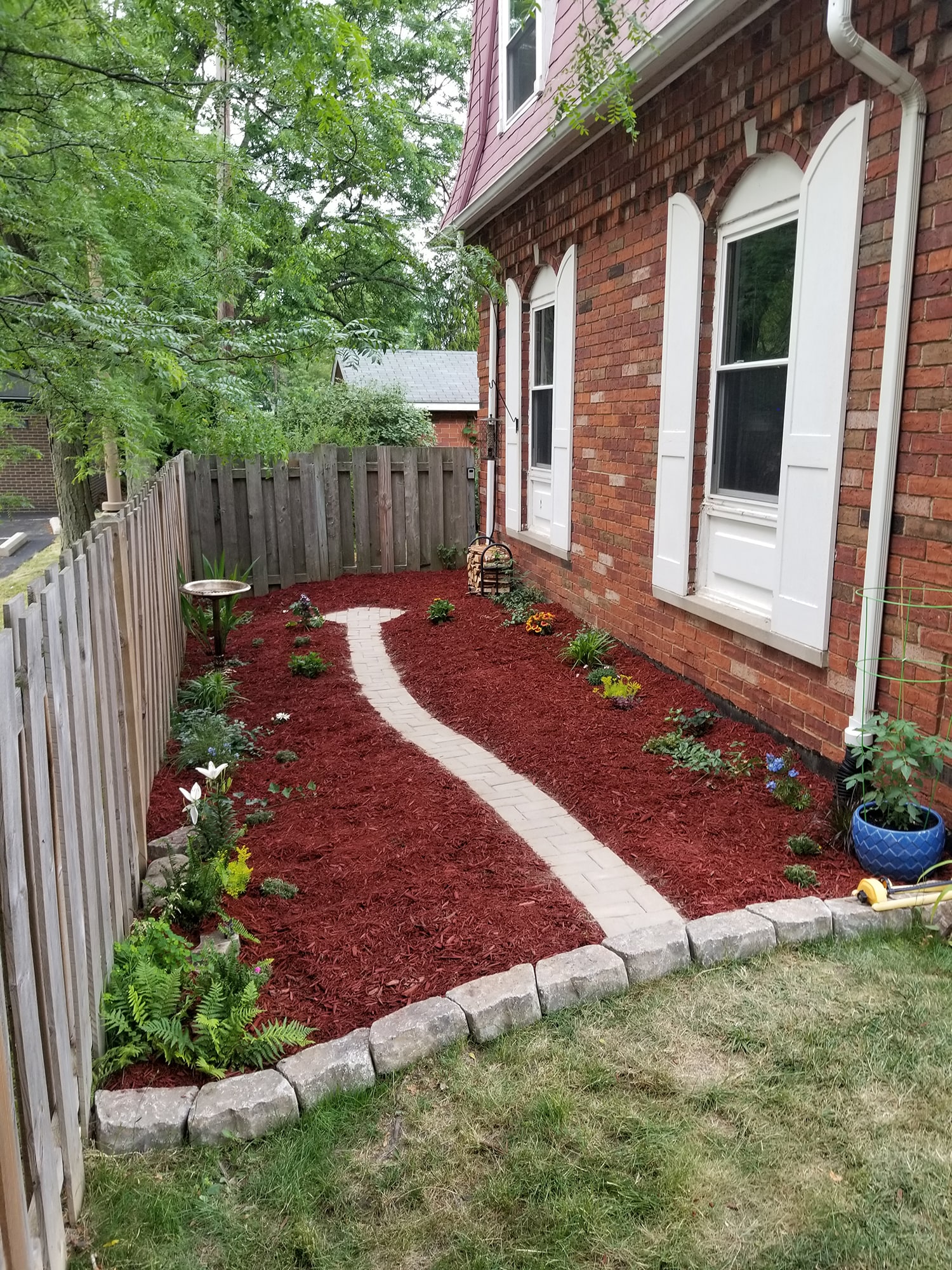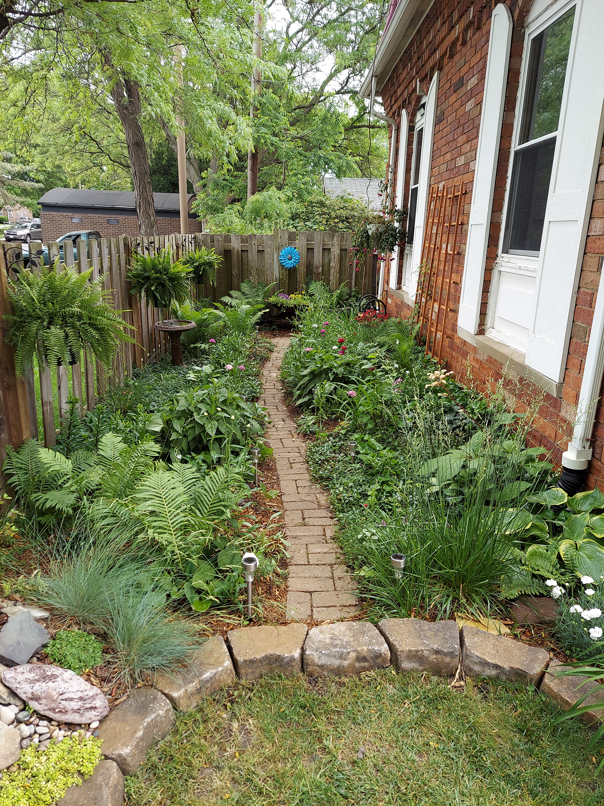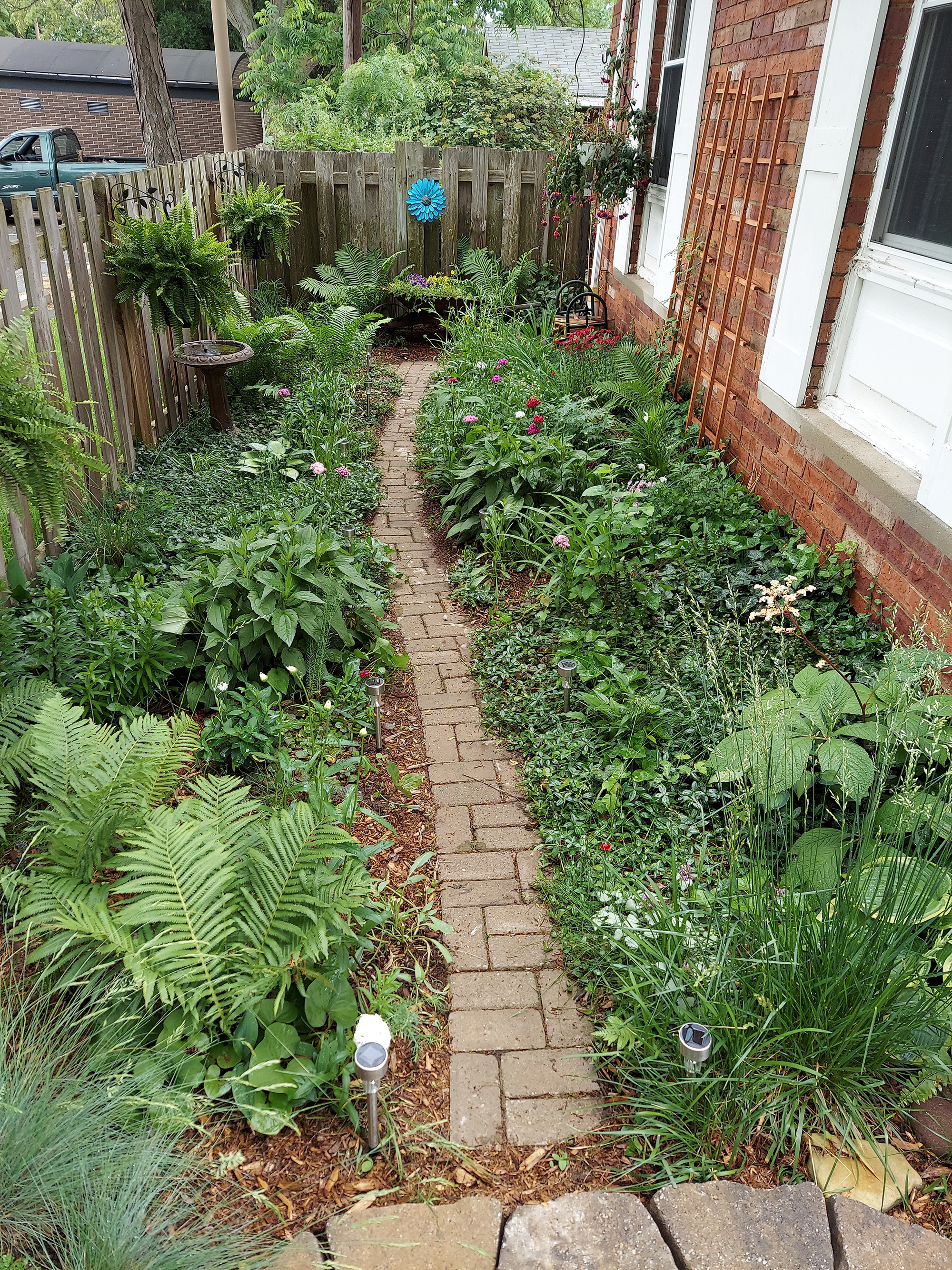 This was the year I annexed the strip of grass between my building and the wooden fence (put up by the Library next door.) I got tired of the lawn crews turning it into a muddy patch of ugly. I extended my stone wall over to the fence, and built a little brick path back along the space. I didn't get much planted this first year, but it looked infinitely better than it had.