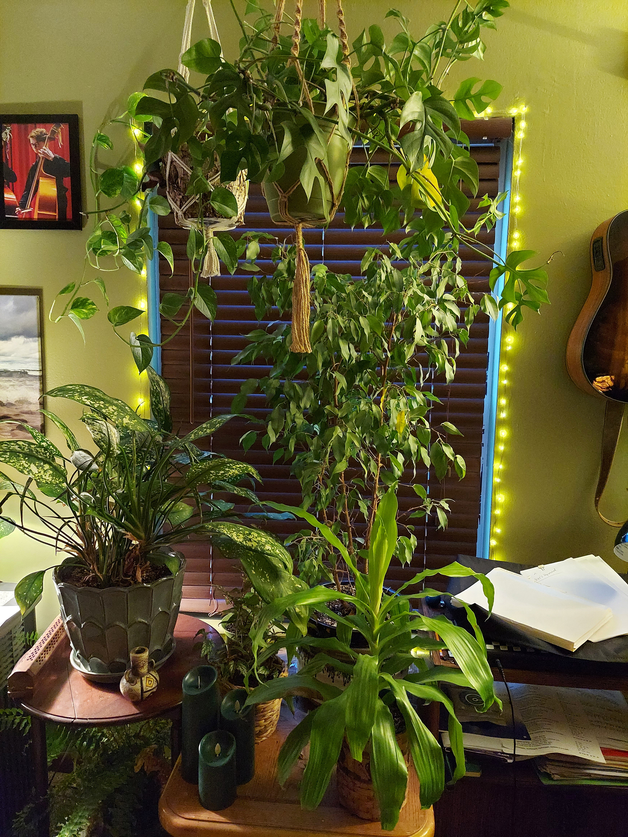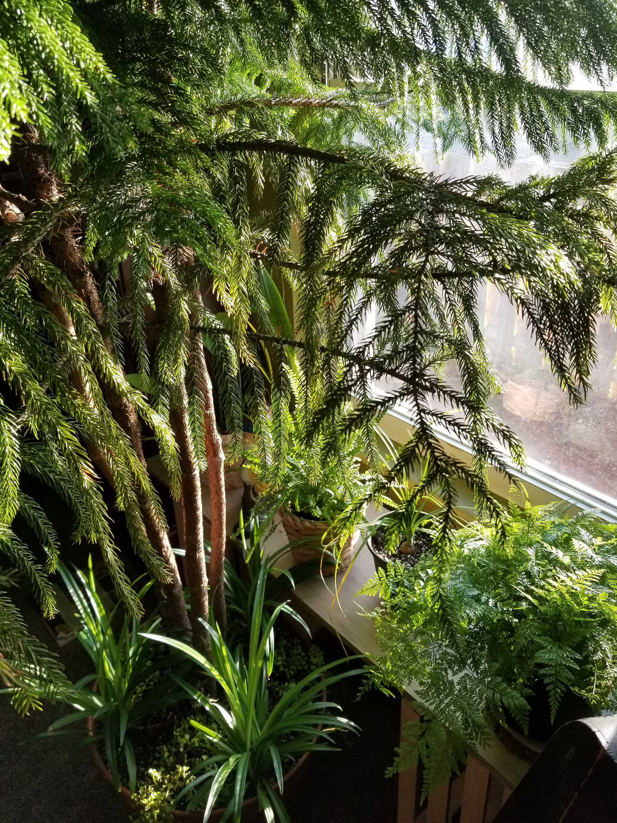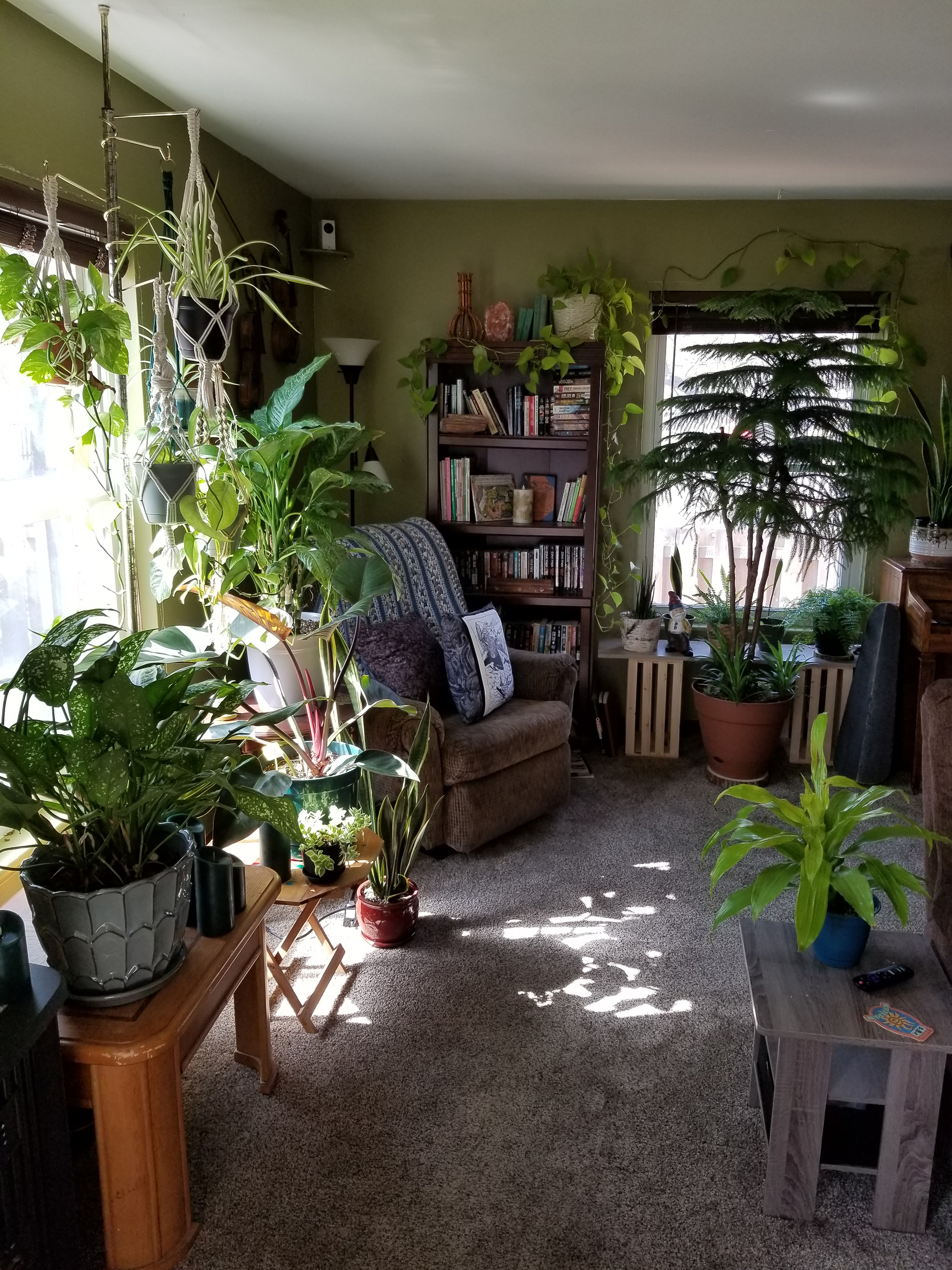 The photos below show the outside as well as some of the larger gatherings of plants indoors. (To get a feel for how much green there is inside, you have to walk through the place though. I keep finding new flat spots that need a plant on them.)